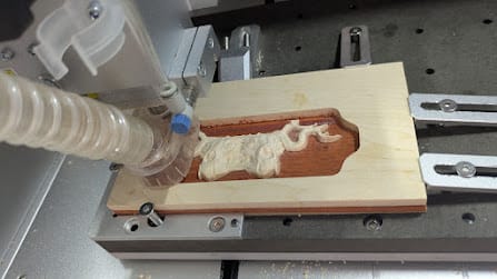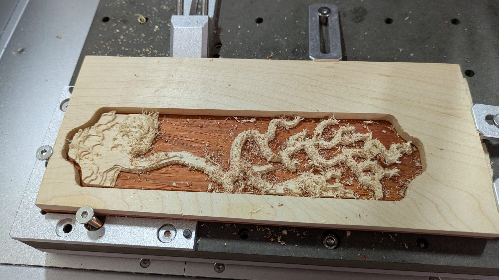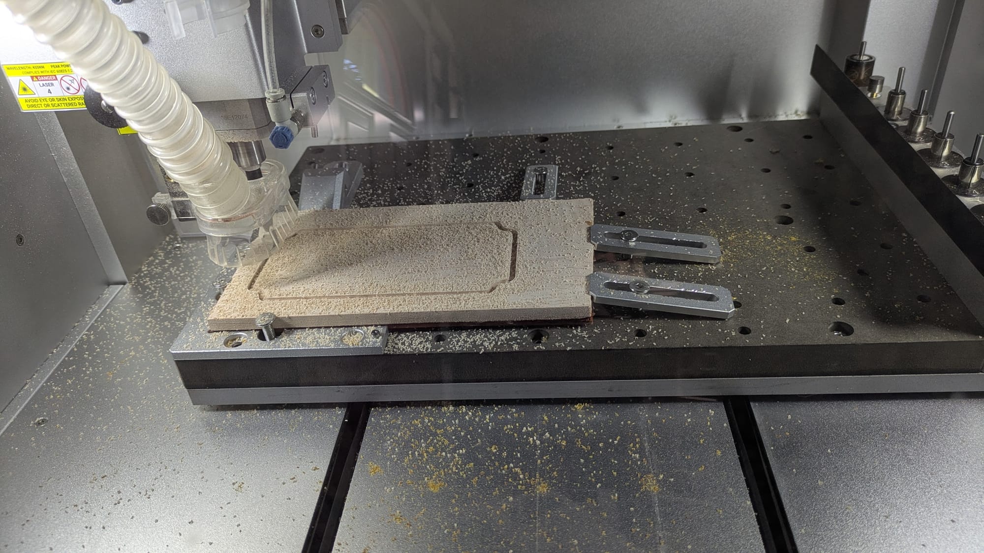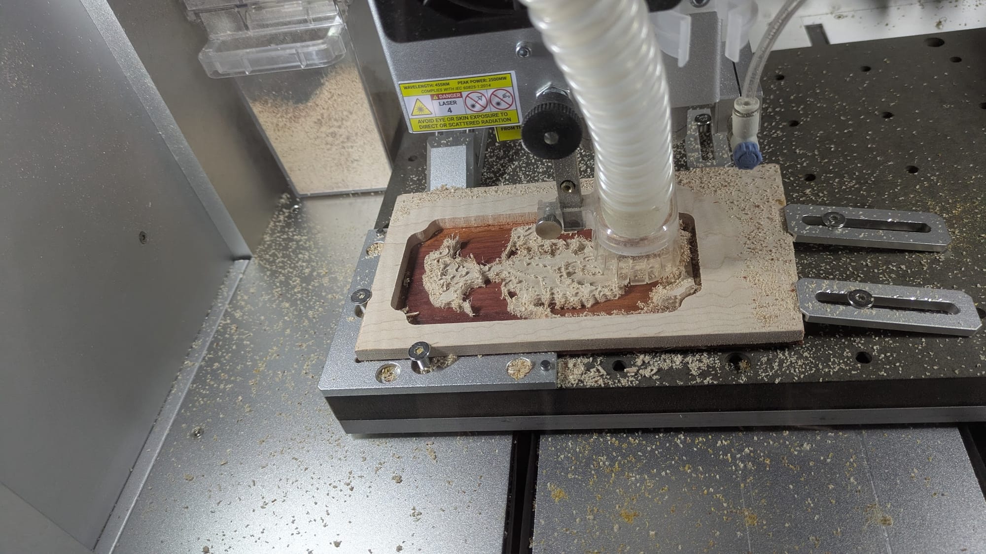 For preparing the file for 3d carving in the CNC machine, I use VCarve, which lets me import my sculpt and set up all the cuts that need to happen, and then it is ready for cutting. The setup is basically this: I cut a profile down to the depth of the first piece of wood around the border. In this case the the top piece of wood is 1/4". I then do a roughing pass with a single flute 3.175 mm end mill bit. I use that same bit to cut a roughing pass using a .02mm matching allowance.