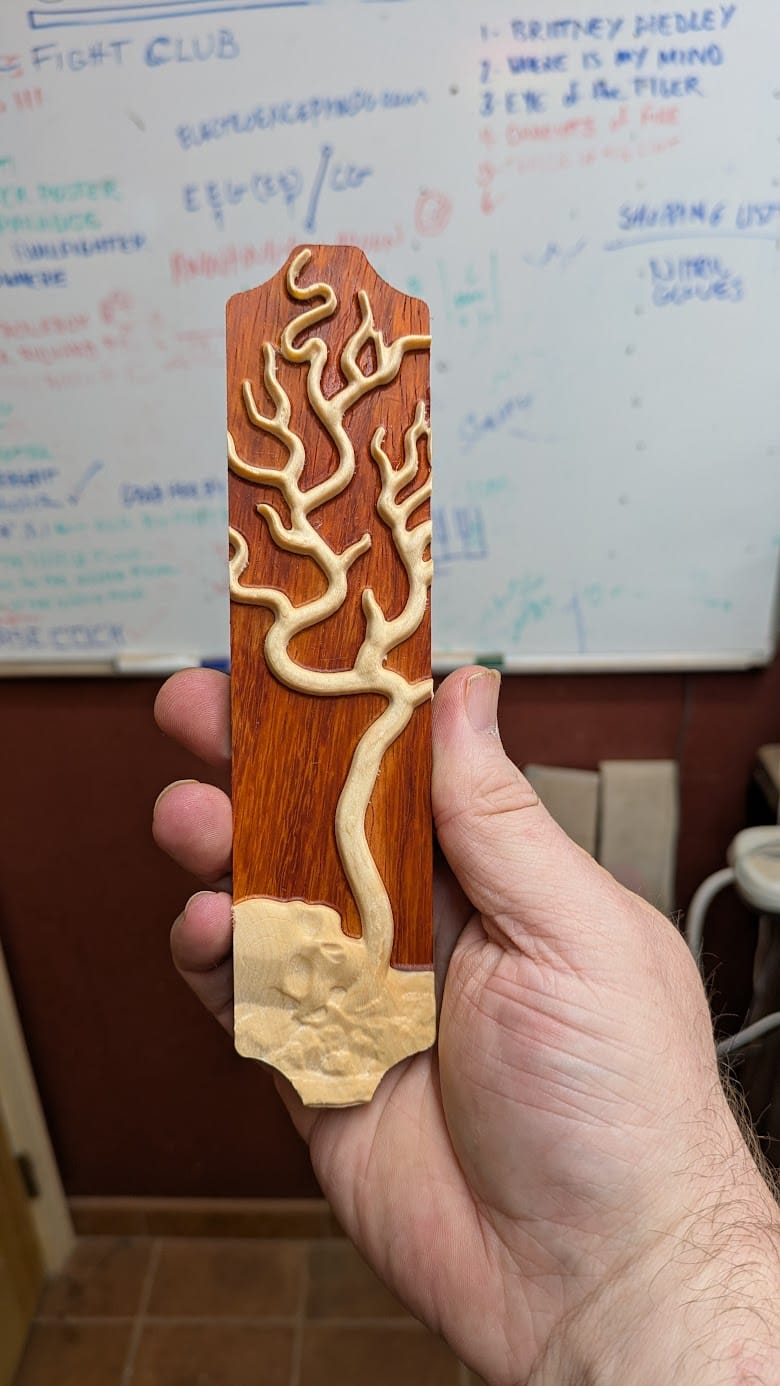 This laminated wood allows me to carve the sculpture through the first layer to reveal the second color, making it much easier to read the silhouette of the sculpture.