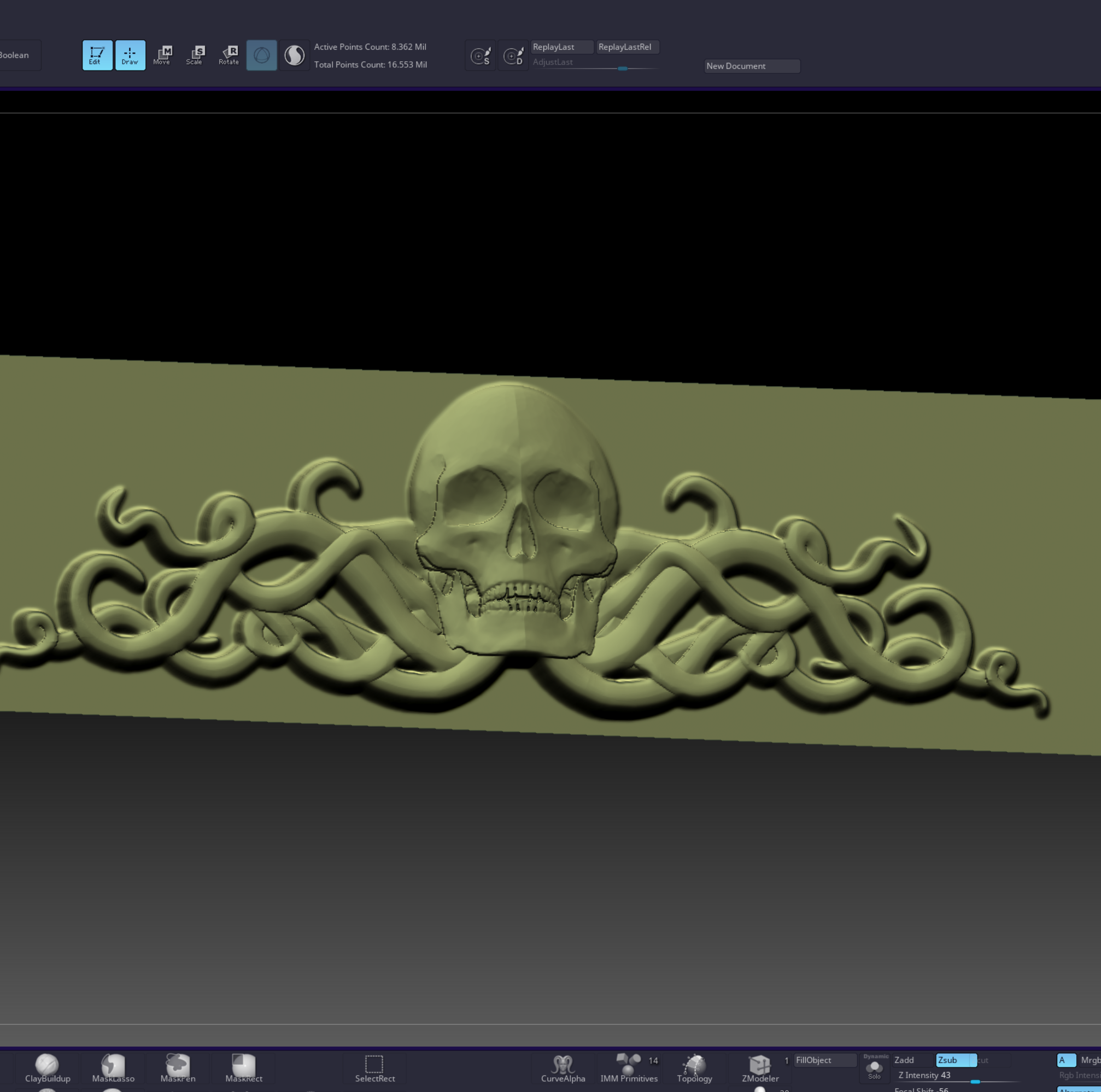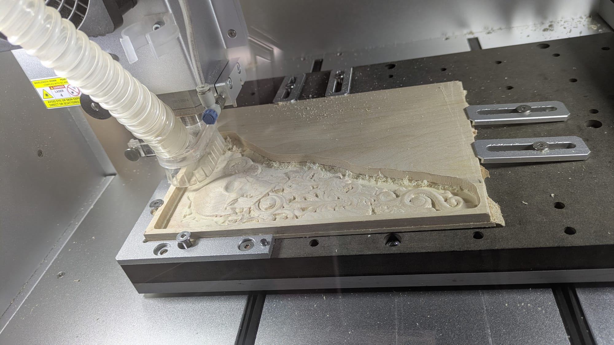 The next step is designing the carvings - these are all created in ZBrush. Typically I sculpt these in full 3d and then use the "Project BasRelief" tool in ZBrush to project the model onto a flat plane. This in my experience has yielded better results than importing a full 3d model into VCarve and letting it generate the height map for carving.
