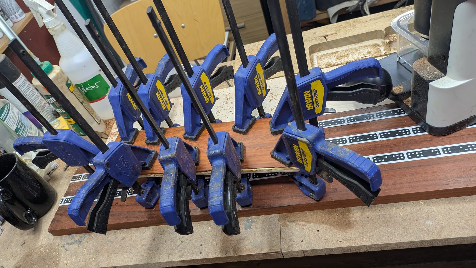 Once I have the carving designed, I need to prep the wood for carving. The way I do is I take 2 planks of wood of different types. In this case I used maple and paduak. I laminated these together using glue and clamps.